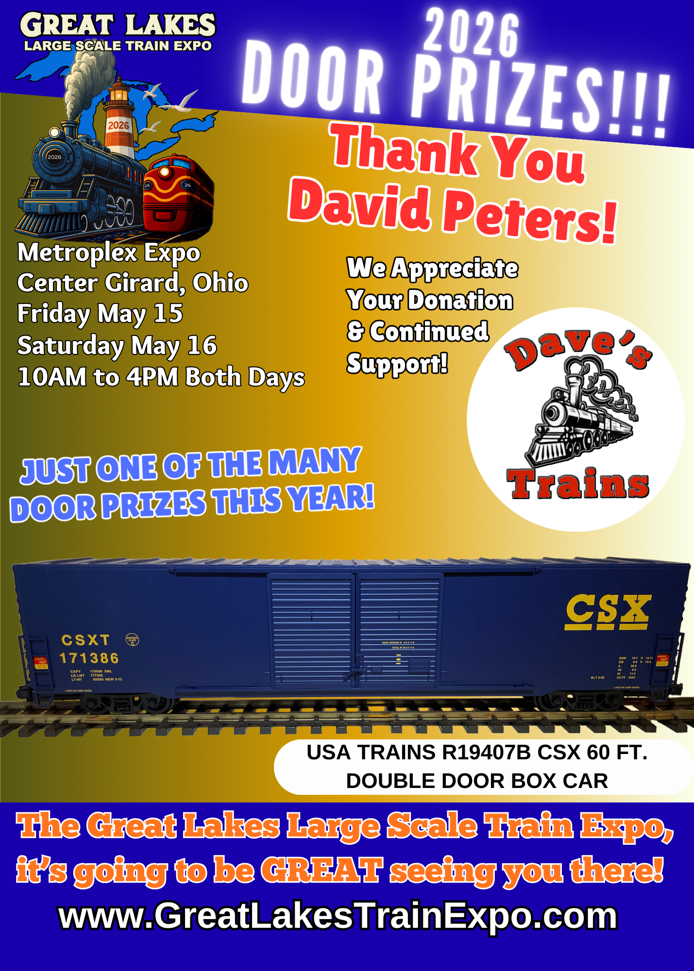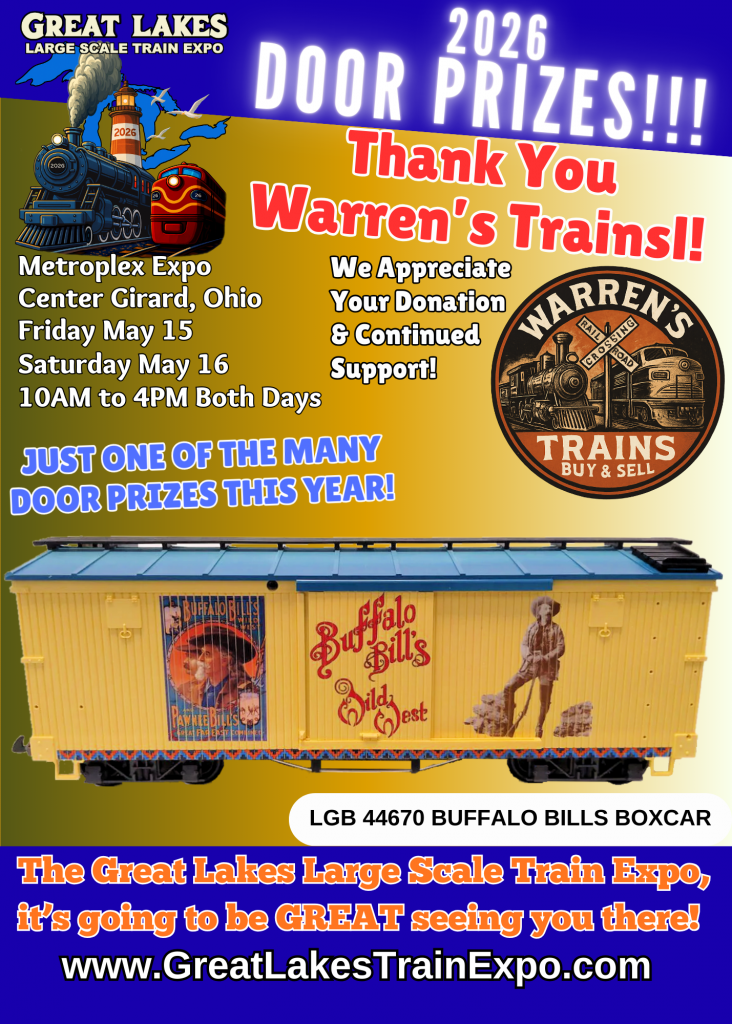 At the Great Lakes Large Scale Train Expo we will be giving away multiple door prizes on the hour, every hour because we’ve had so many great items donated!